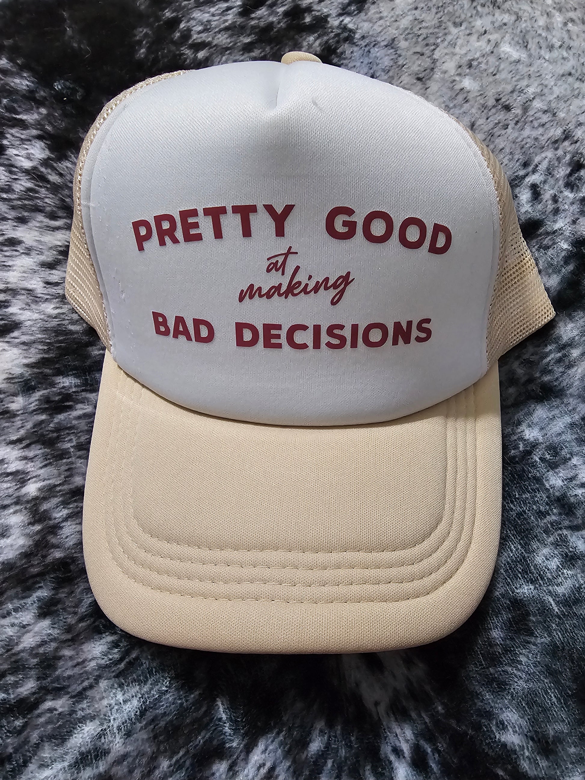 Introducing the Bad Decisions Trucker Hat, perfect for any stylish and practical individual. Made with a classic trucker hat design, this hat offers a breathable and comfortable fit. Whether you're running errands or hitting the beach, this hat will elevate any outfit with its trendy yet functional style.