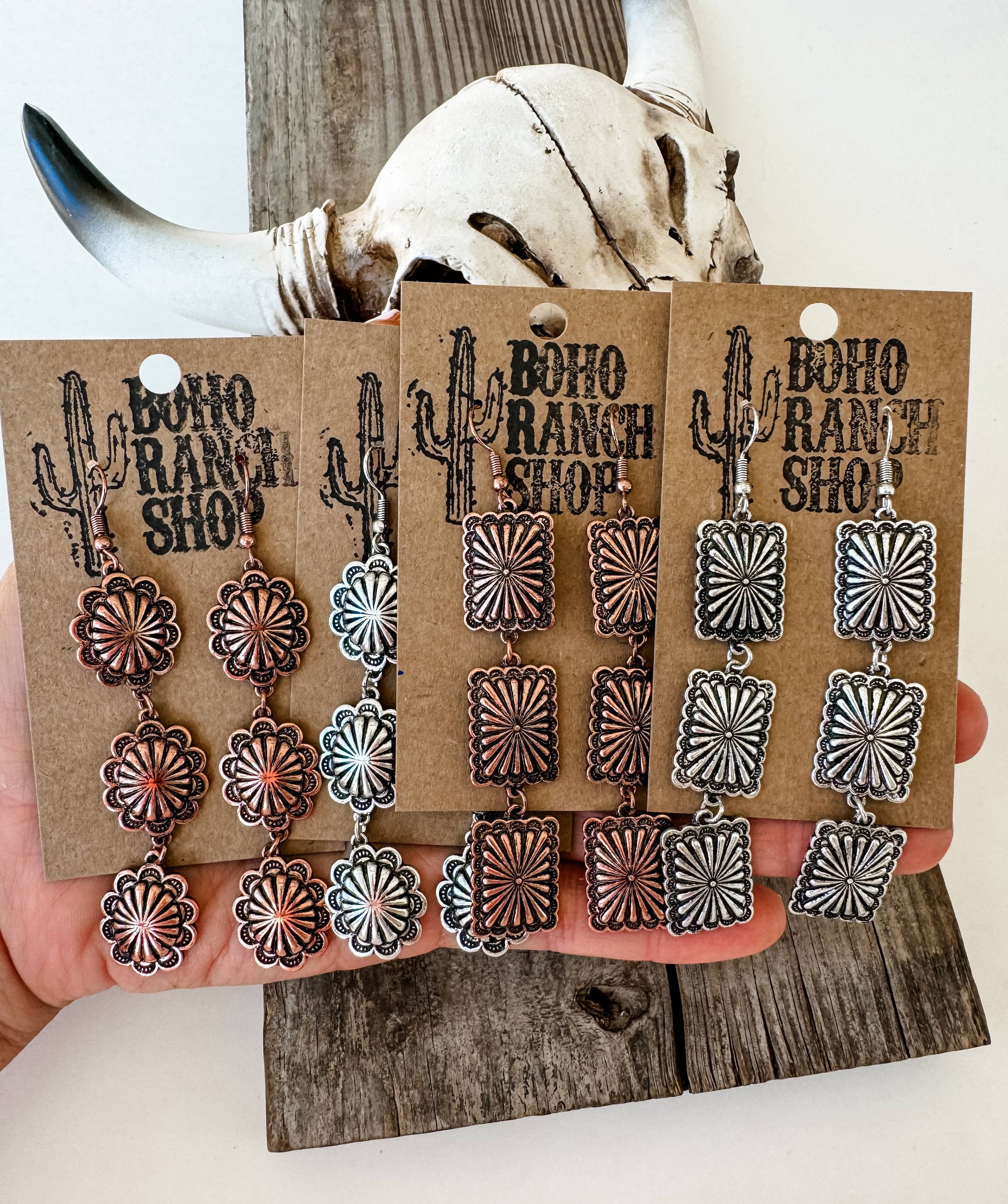 Western Concho Dangle Earrings Burnished Silver or Copper 3.75” drop fish hook Lightweight