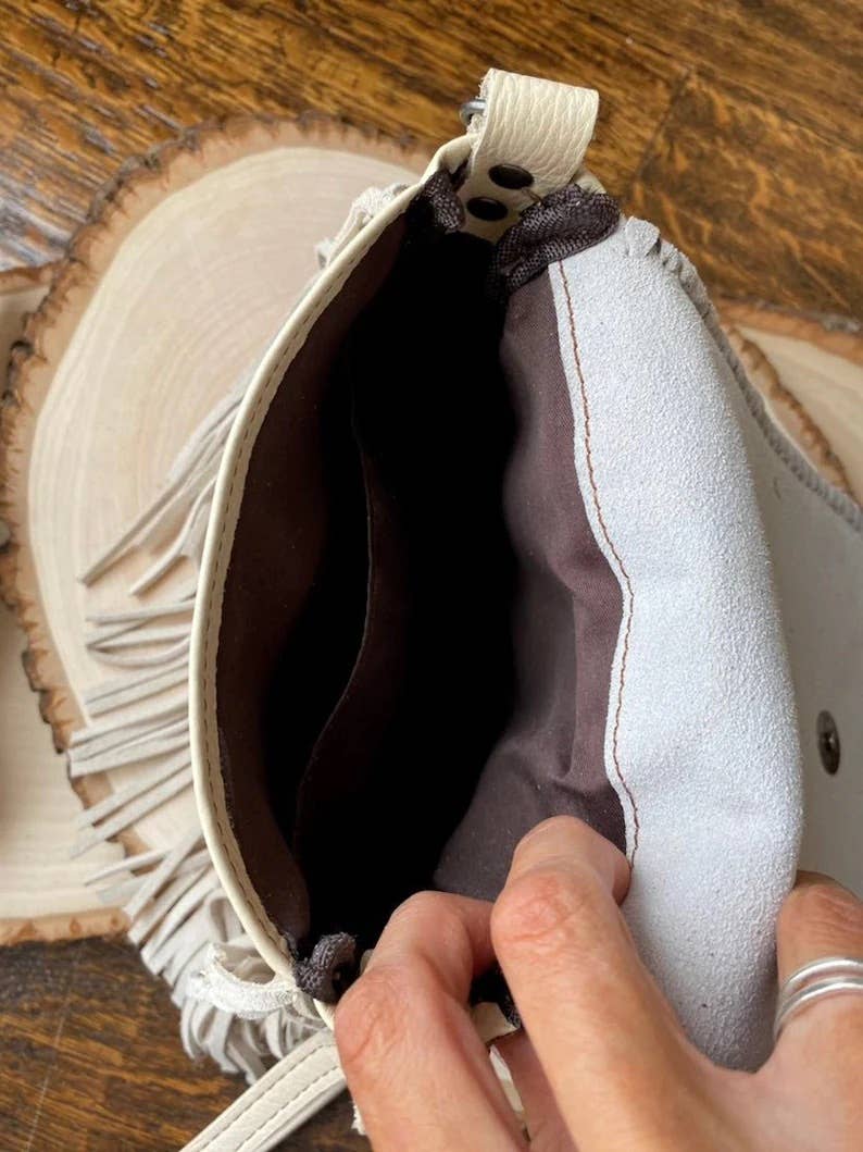 MEDIUM: 7.5 x 7” x 1.5" (Not including the fringe) 53" length shoulder strap